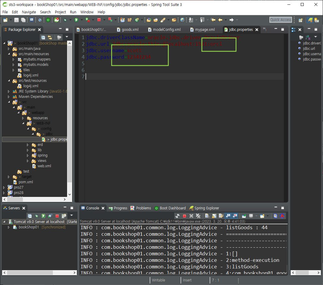 + 에러시 jdbc.properties 파일의 계정/비번이 맞는지 확인하고 다르다면 수정한다.