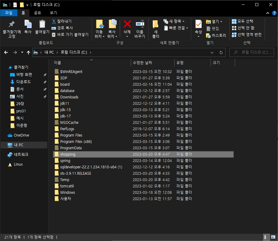 pro31 폴더안의 shopping폴더는 C드라이브 안에,
