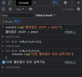 Crome 크롬 개발자도구 줄바꿈하기 shift + enter