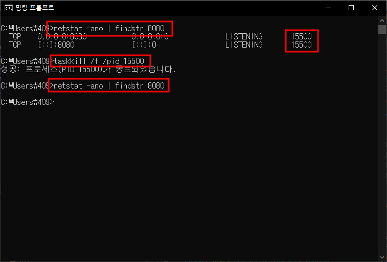 해당 포트 프로세스를 종료해 초기화해주면 됨.