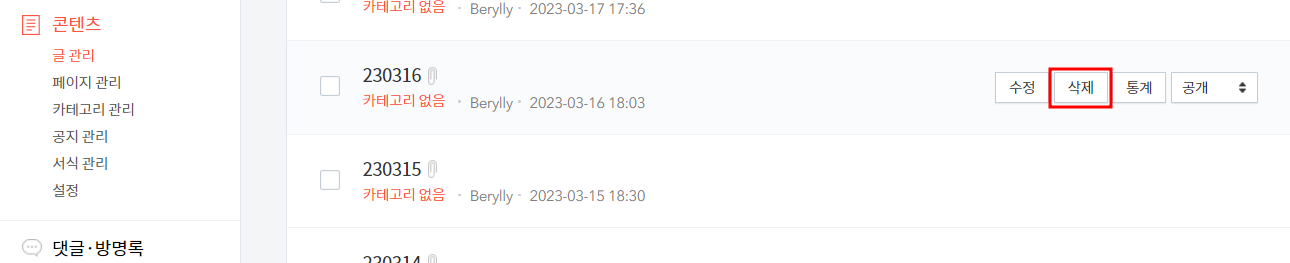 신경쓰인다면 관리자페이지 - 글관리에서 직접 삭제하는방법을 이용하자.