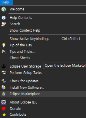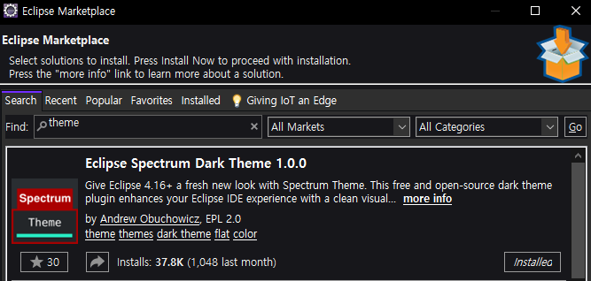 이클립스마켓으로 진입해 theme입력후, Spectrum Dark Theme을 install.