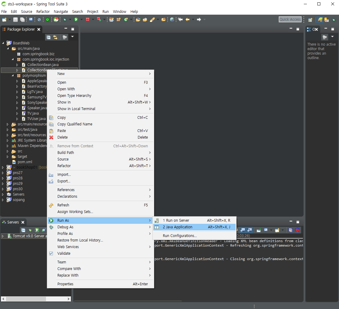'main메소드가 있는 java 파일에서' 오른쪽 마우스 - run as - java application