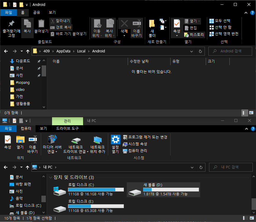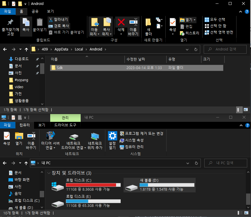 기존 C드라이브 경로는 완료후 삭제를 위해 잠시 메모해두자.