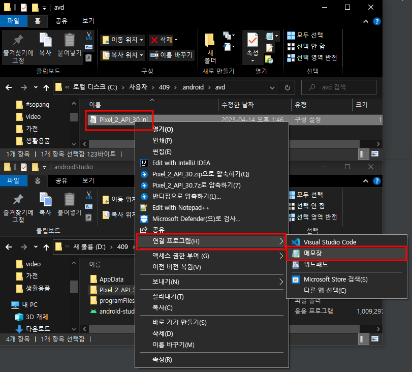 안드로이드 스튜디오 서비스를 종료하고, *.ini파일을 메모장으로 열어