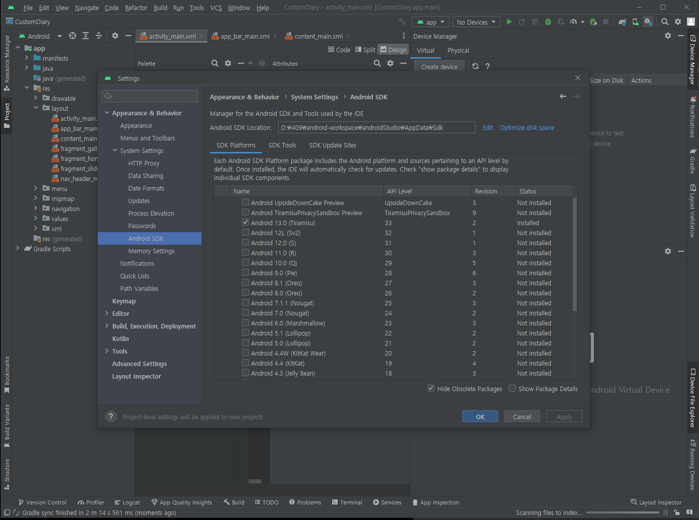 finish, 완료되면 Android SDK에 경로가 바뀐것을 확인 할 수 있다.