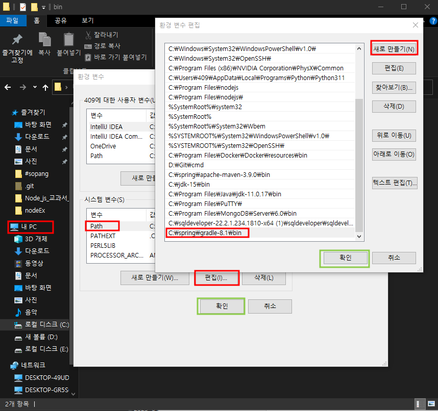 환경변수 - path선택 - 편집 - 새로만들기 - 경로저장 - 확인 - 확인