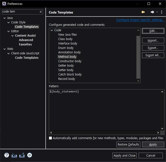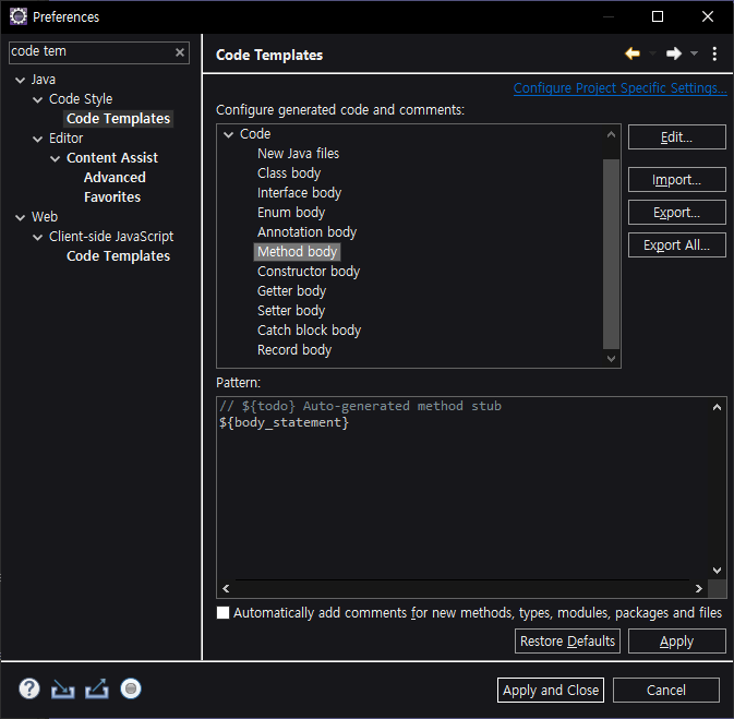 Eclipse 자동완성 자동주석 제거 Window -> Preferences>검색 Code Templates> Method body> Edit> 주석줄제거> 저장