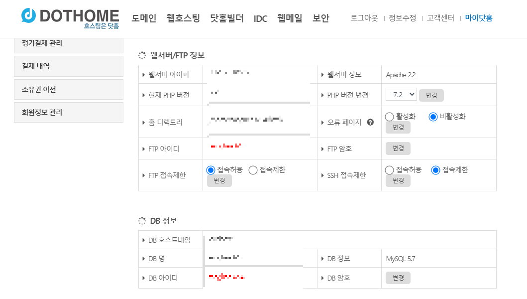 닷홈접속 - 로그인 - 마이닷홈 - 웹호스팅목록 - 상세보기 - 웹서버/FTP정보