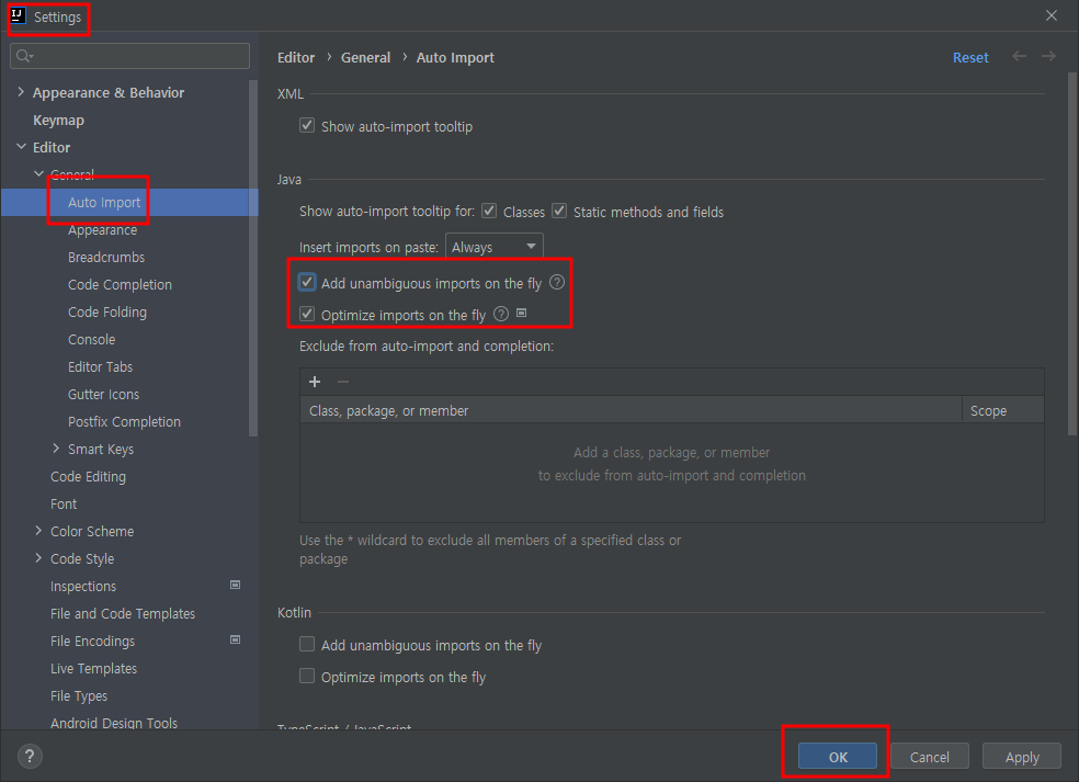file-settings - auto import - 2개체크