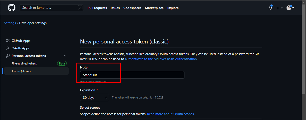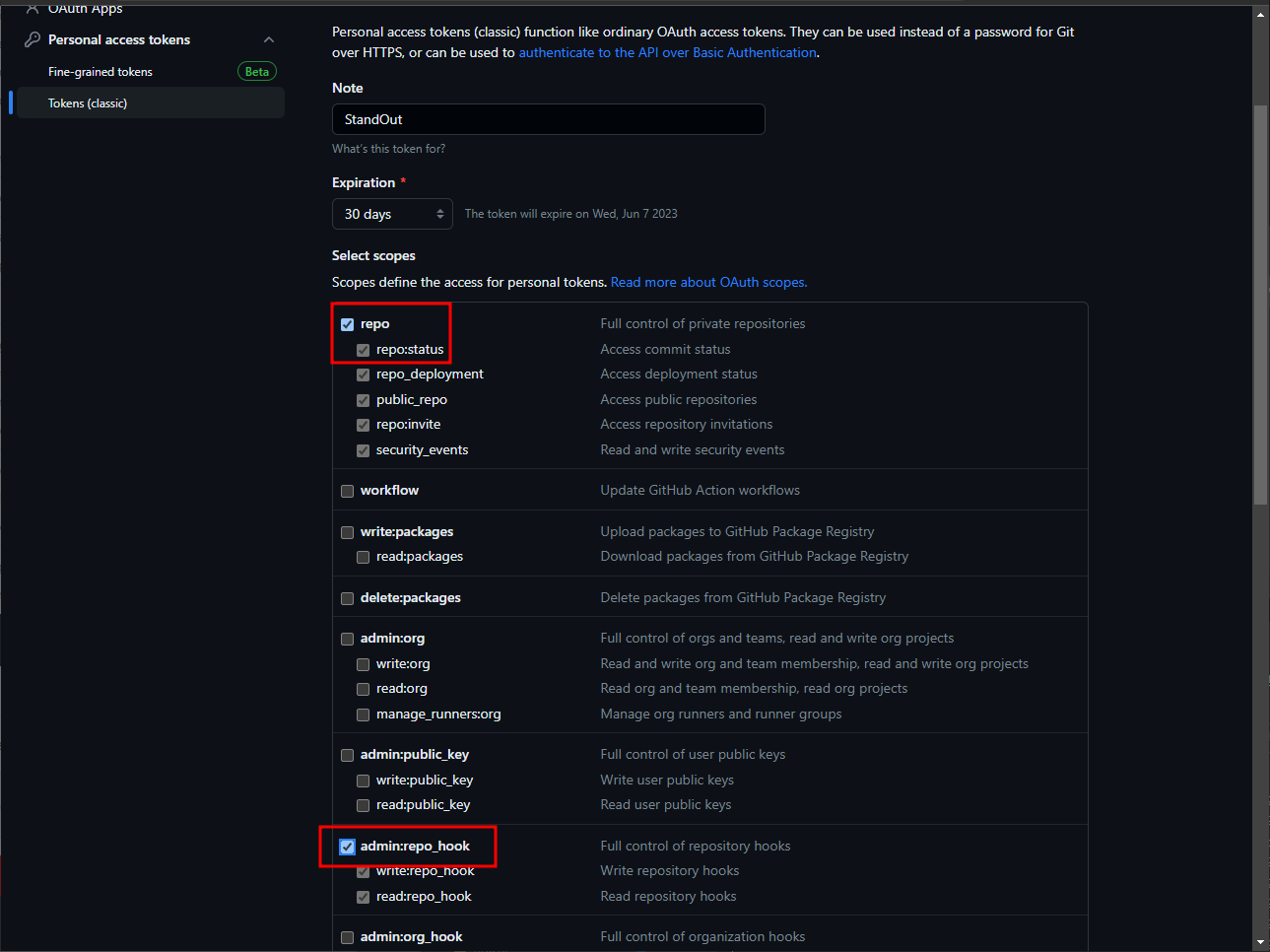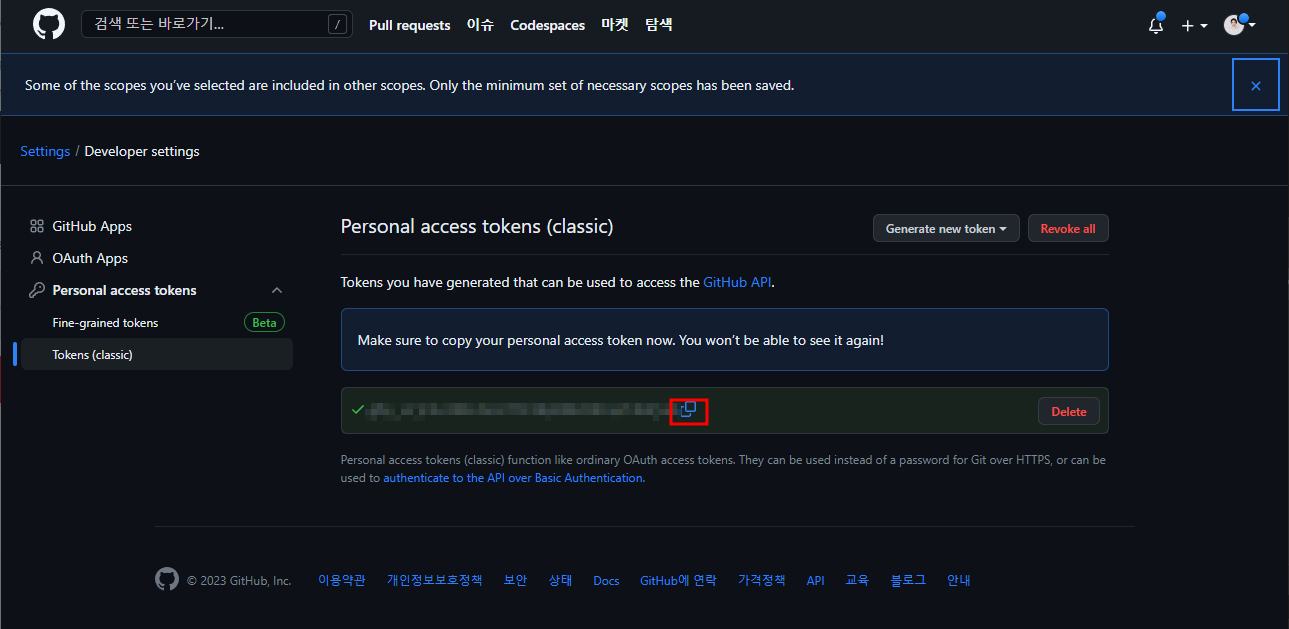 repo, adminb:repo_hook 선택 - Generate token