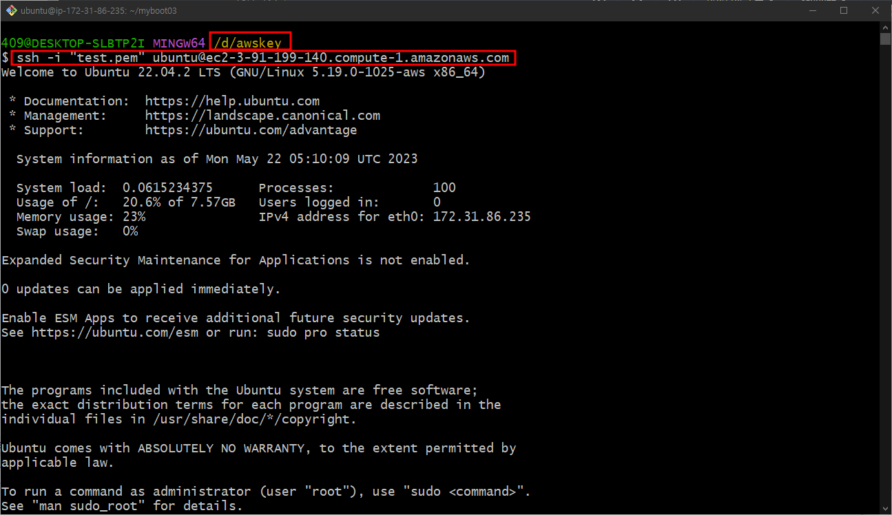 인스턴스 - 생성한 인스턴스 - 연결 - SSH 클라이언트 예:코드 복붙
