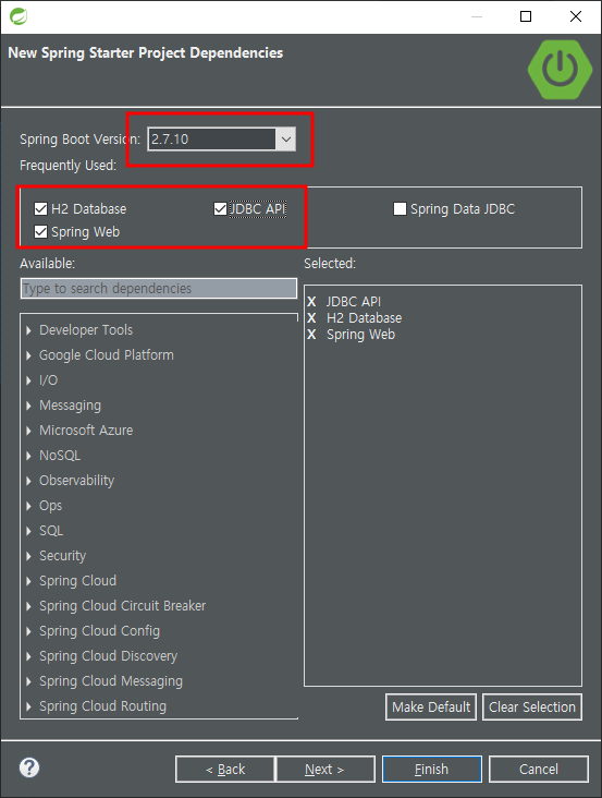 File > New > Spring Starter Project - 프로젝트 정보입력 - type:gradle - 데이터베이스 및 springweb체크 - finish