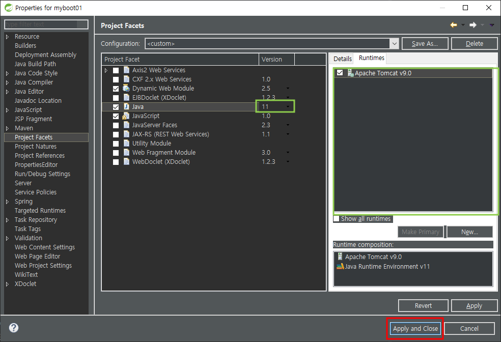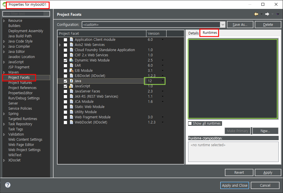 프로젝트 우클릭 - properties - project Facets - runtime클릭