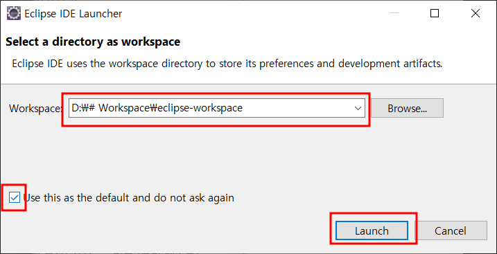 workspace 지정, 앞으로 작성될 소스를 저장할 공간을 지정한다.