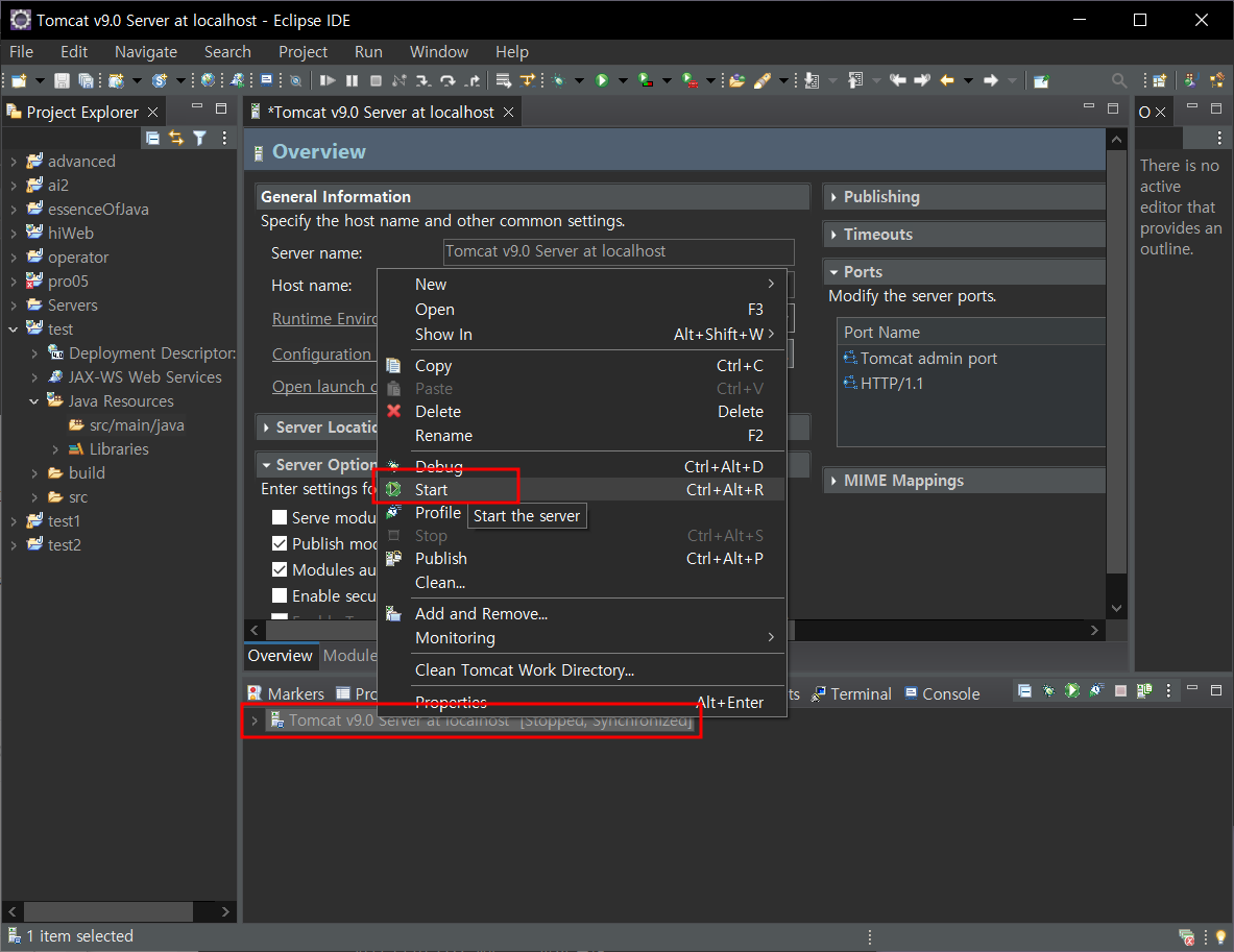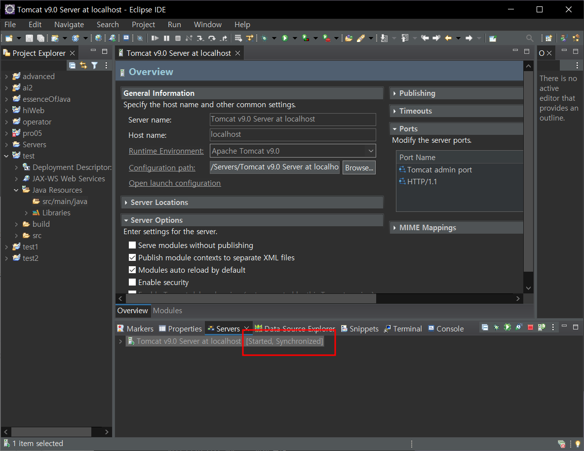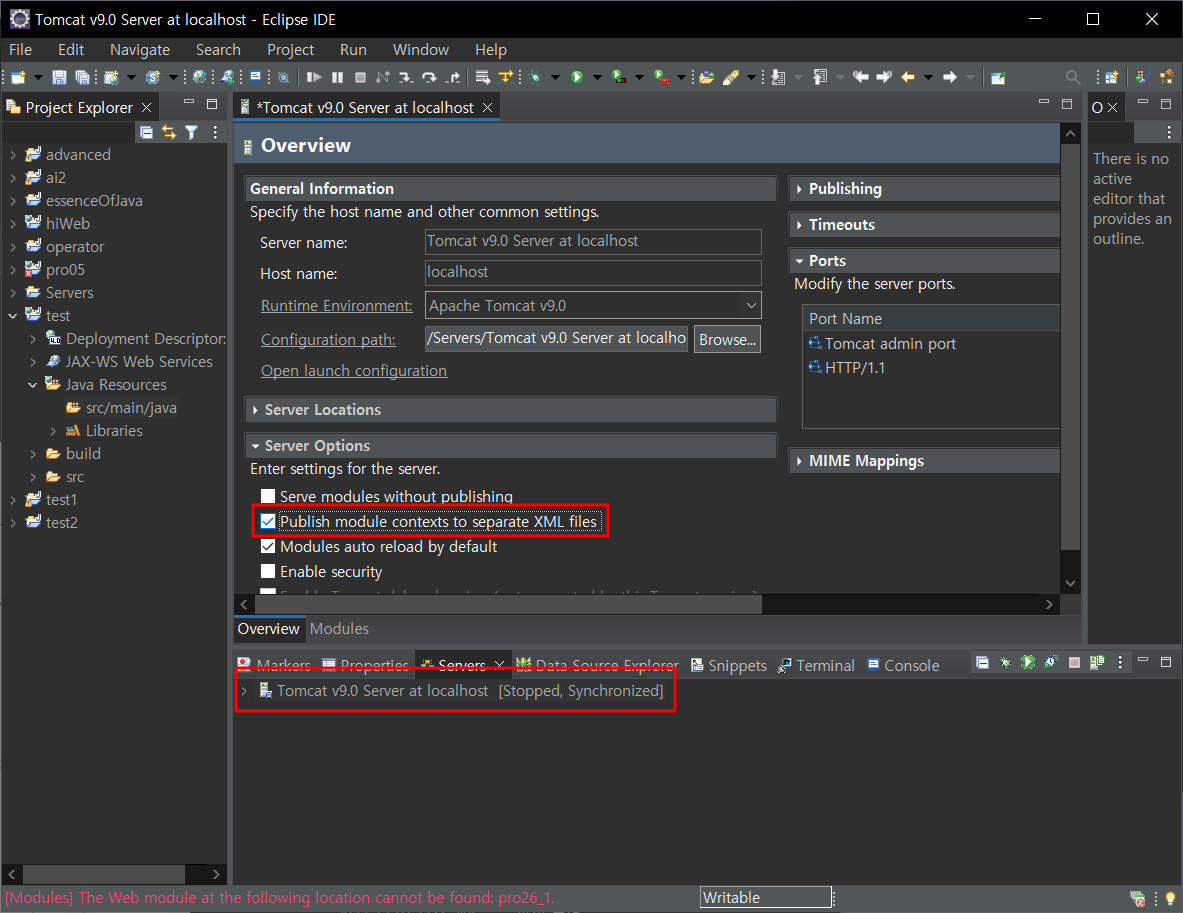 server - 톰캣서버 더블클릭 - server options - publish module contexts to separate XML files 체크 - ctrl s 저장