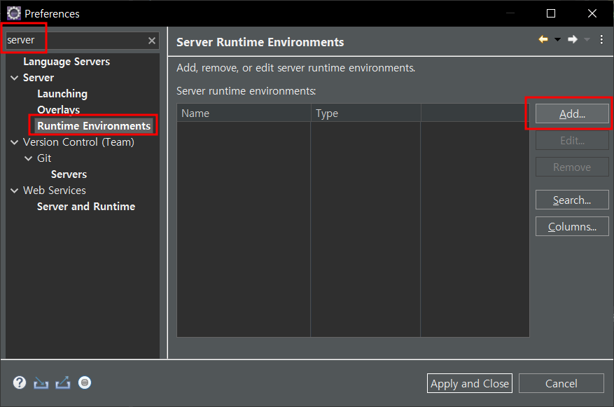window - perference - server - runtime enviroments - add