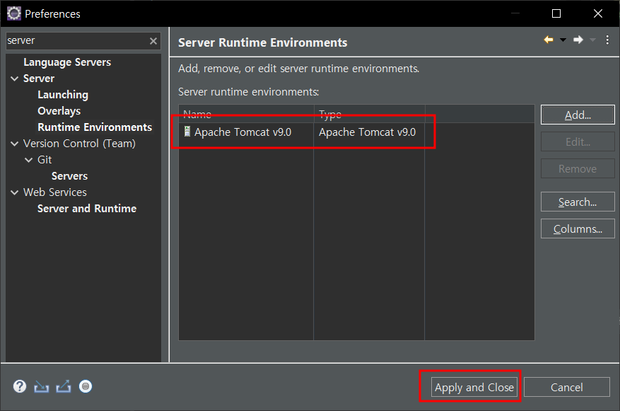 추가된 톰캣 확인 - appy and close