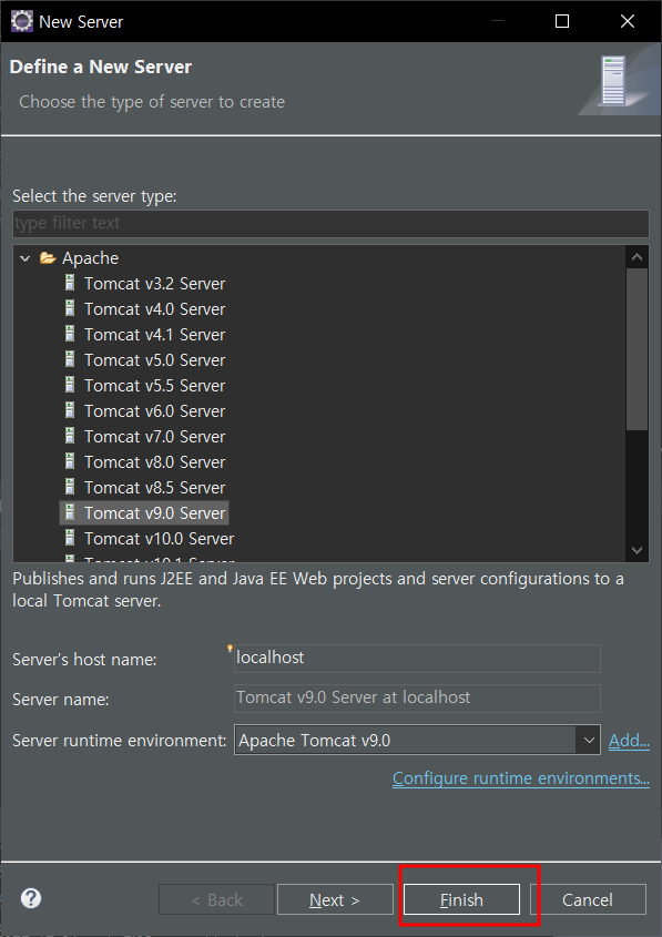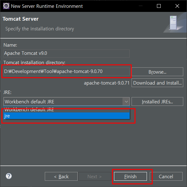 다운받은 톰캣 경로 연결 - 다운받은 java 선택 - finish