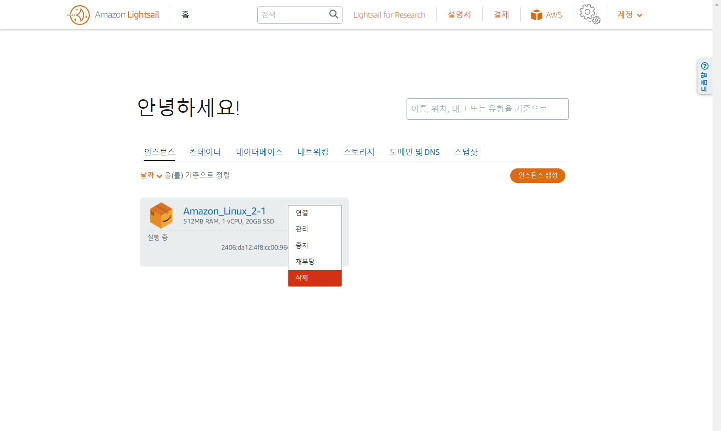 aws - lightsnail 접속 - 인스턴스 확인 - 삭제