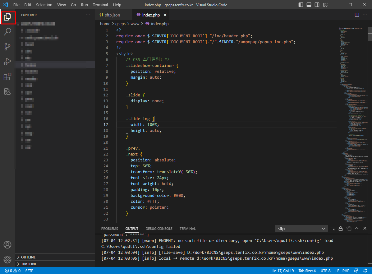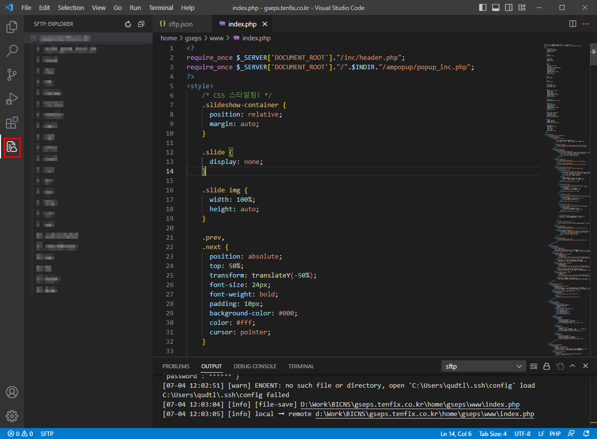 SFTP 확장 프로그램 설치 서버에 연결될 로컬폴더 생성 키보드 F1 - sftp:config 생성되는 샘플 sftp.json에 연결정보 작성 키보드 F1 - sftp:list all 서버선택 원하는 폴더를 선택하거나, choose current folder시