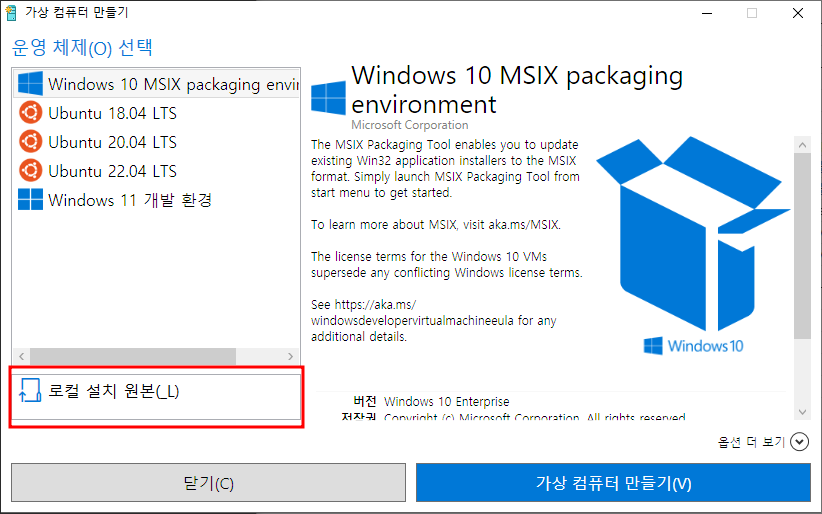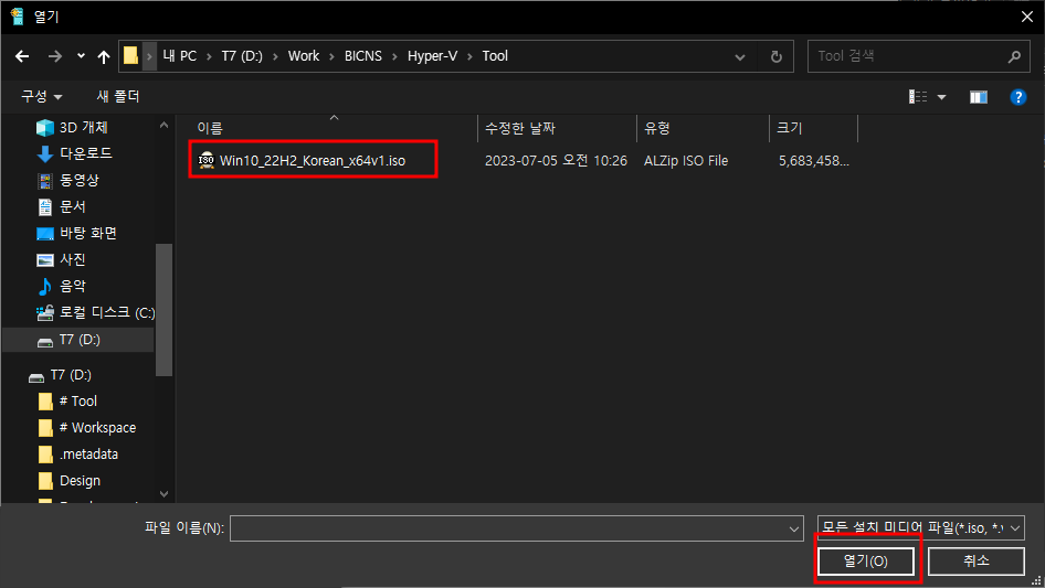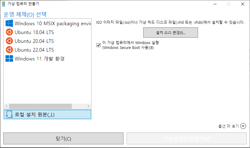 재시작완료 - Hyper-V 빨리만들기 - 로컬설치원본 - iso 이미지 파일 선택 - 가상컴퓨터만들기