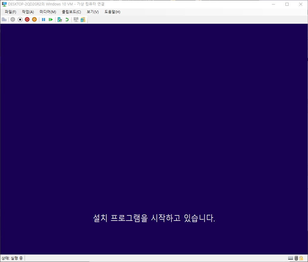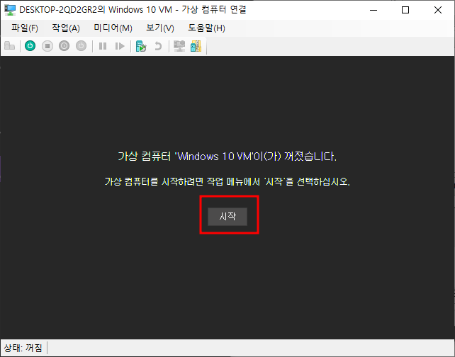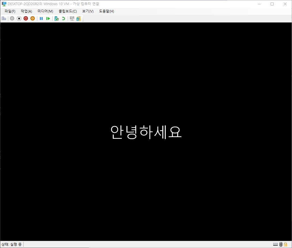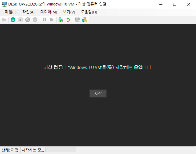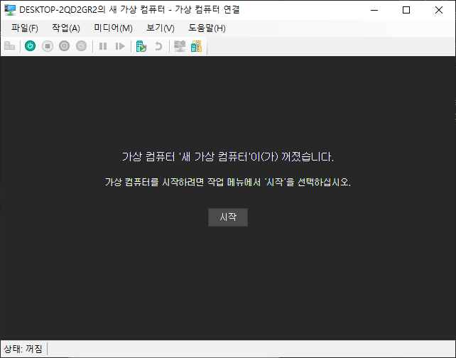 Hyper-V 관리자 - 생성한 가상 컴퓨터 선택 - 연결 - 시작