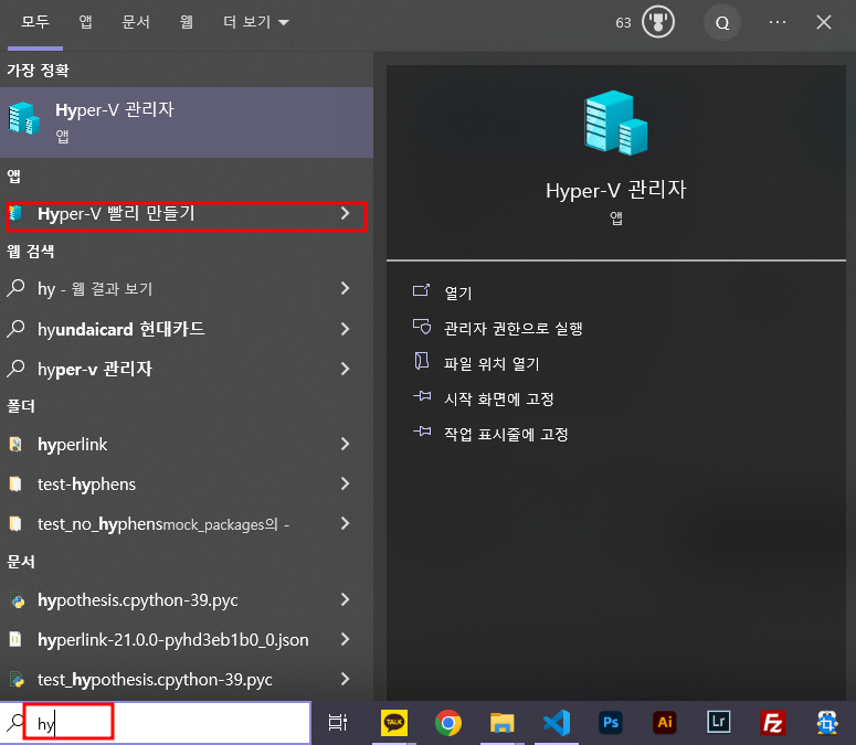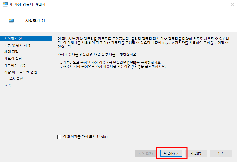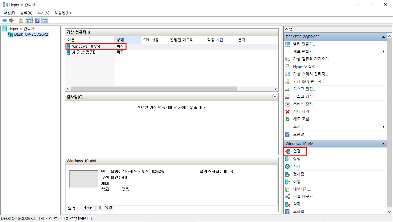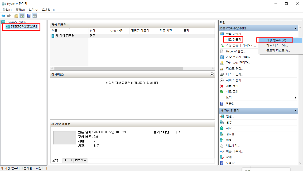 창을 닫고, Hyper-V 관리자로 직접만들어보도록 하자.