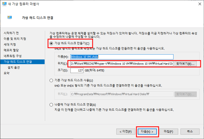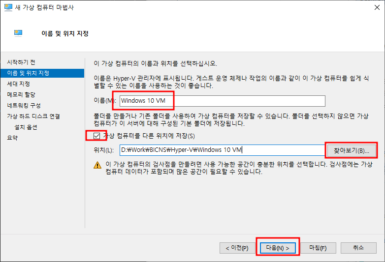 이름 및 위치지정 - 이름설정 - 체크(가상 컴퓨터를 다른 위치에 저장) - 복사해놓은 경로 붙여넣기