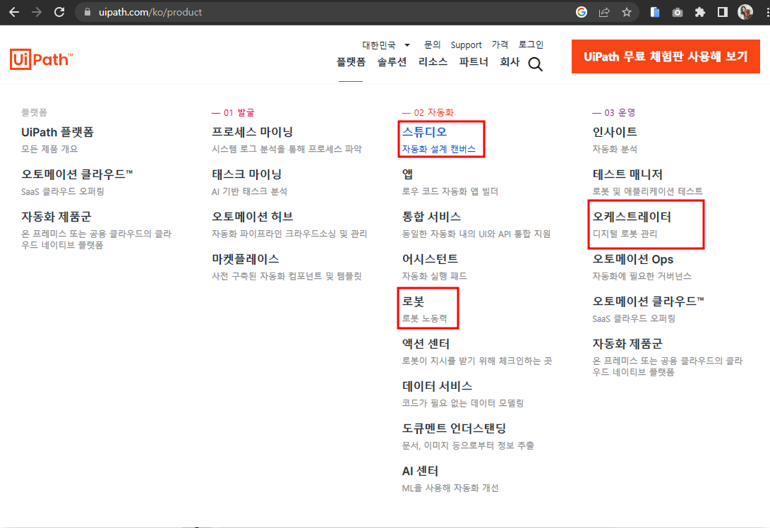 스튜디오는 개발용, 로봇은 유인/무인으로 나뉘어 실행용이며 오케스트레이터는 관리용으로 쓰인다.