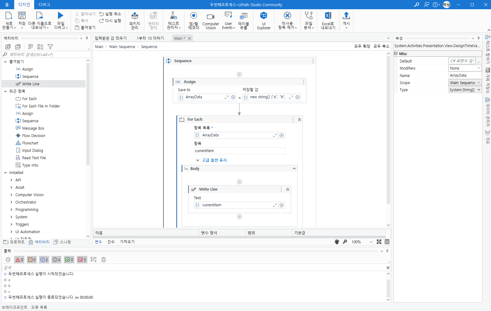 ArrayData - new string[] {"a", "b", "c"} 저장 - for each - writeline - 항목변수 - 실행