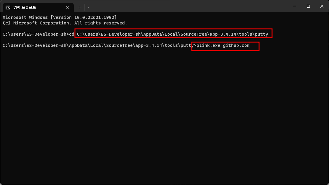 cmd - 복사한 경로로 이동 - plink.exe github.com 명령 - y - 닫기