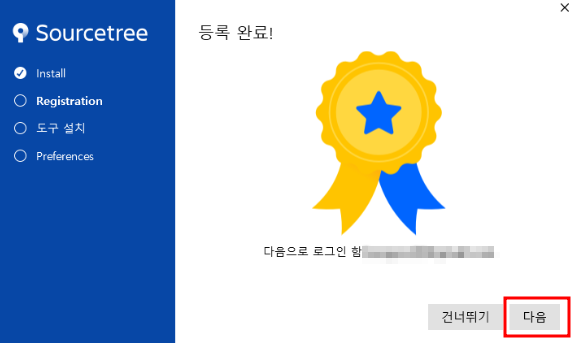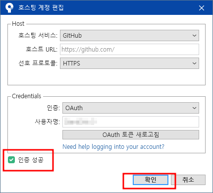 아래와 같이 완료되었다는 화면이 뜨면 동시에 소스트리에도 인증성공이 뜬다 - 확인