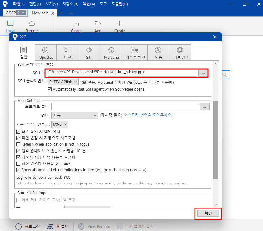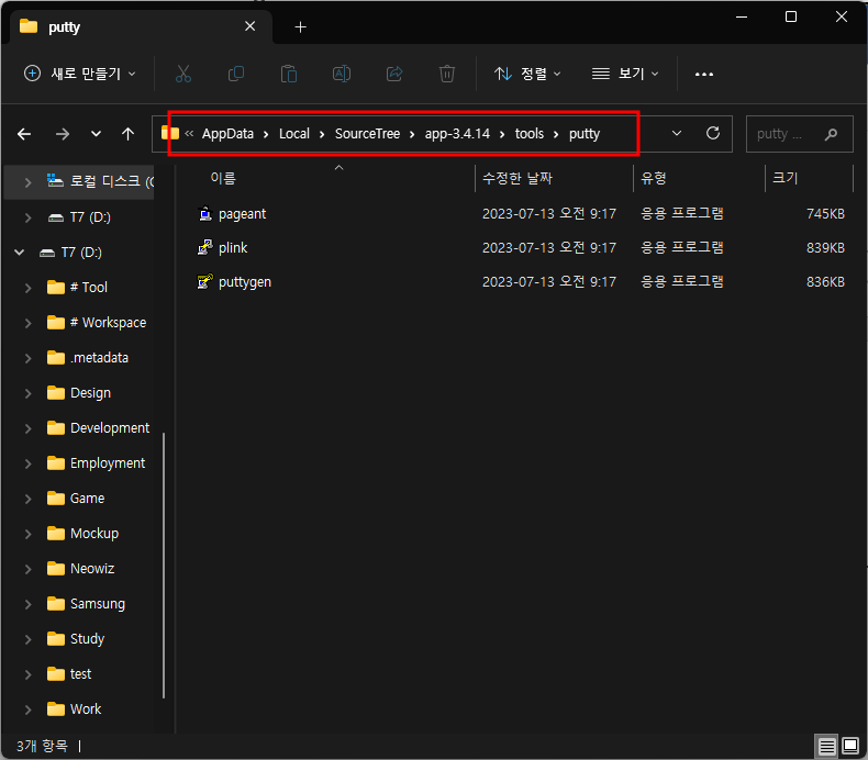 소스트리 다운로드 파일위치 확인 - ~AppData\Local\SourceTree\app-3.4.14\tools\putty 경로로 이동 및 경로복사