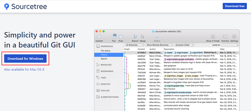 A Git GUI that offers a visual representation of your repositories. Sourcetree is a free Git client for Windows and Mac.