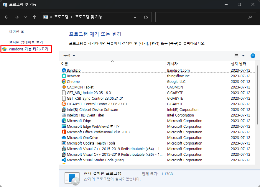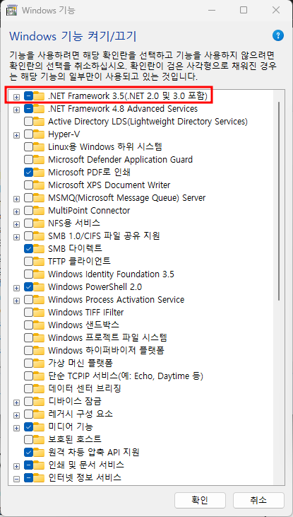 프로그램 및 기능 - Windows 기능 켜기/끄기