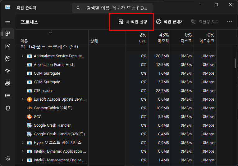 Ctrl + Shift + esc 작업관리자켜기 - 새작a업실행