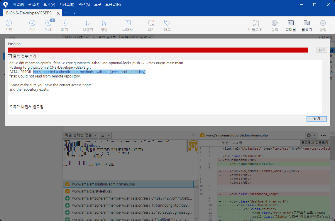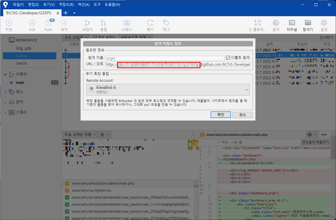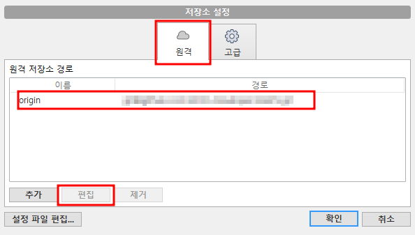 설정 - 원격 - 저장소경로선택 - 편집 - 발급받은 token을 https://와 github사이에 삽입 후 @추가