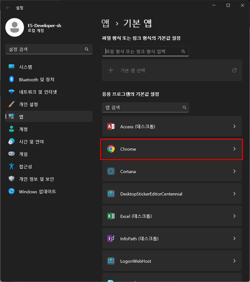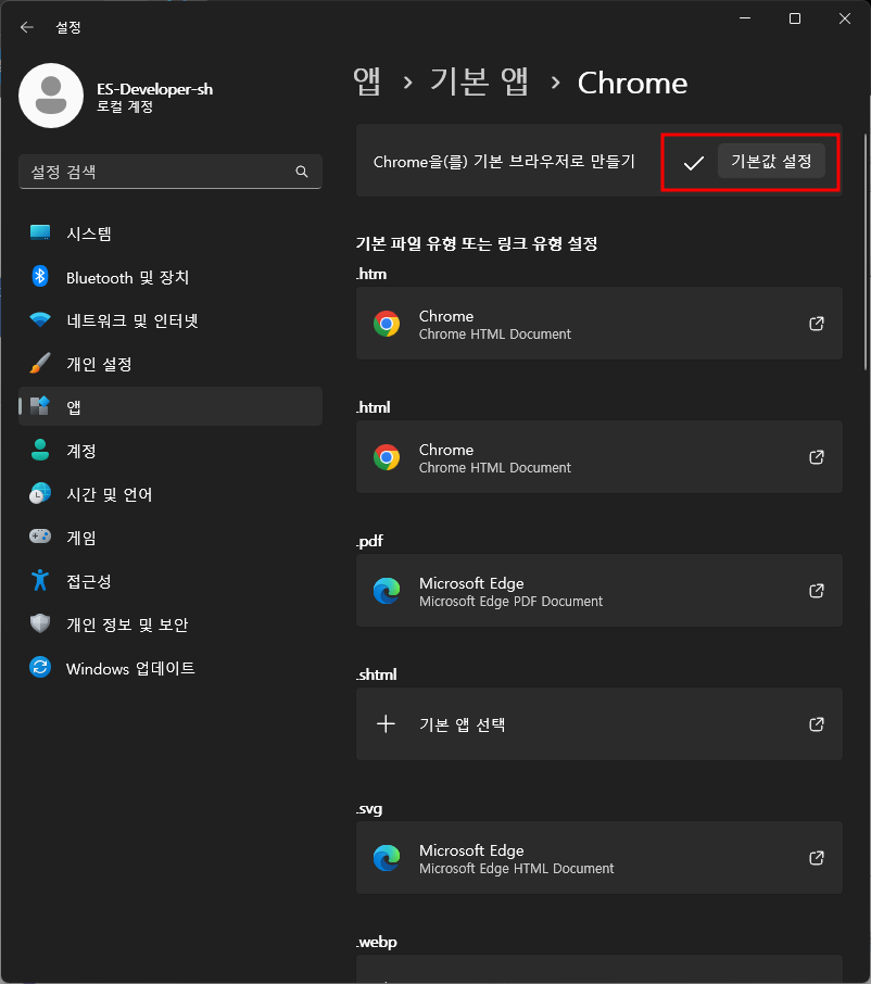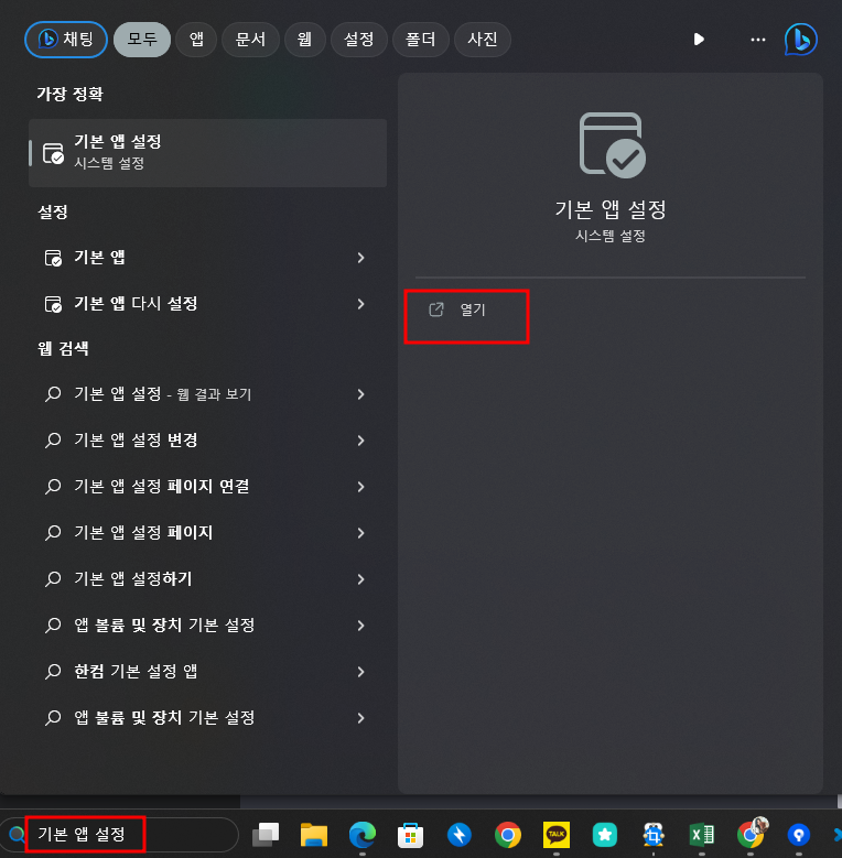 기본 앱 설정 - 열기 - 크롬 - 기본값설정