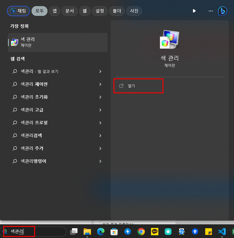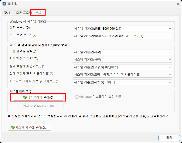 모니터식별 - 선택 - 고급 - 디스플레이 보정