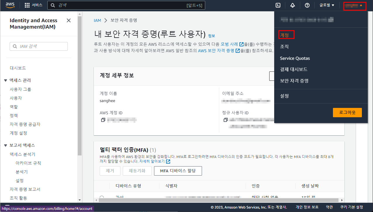 aws - 계정이름클릭 - 계정