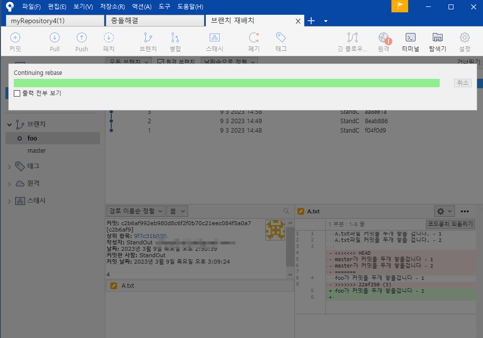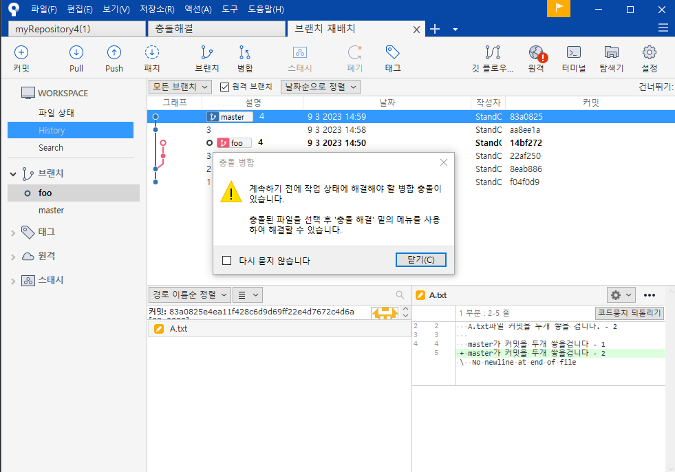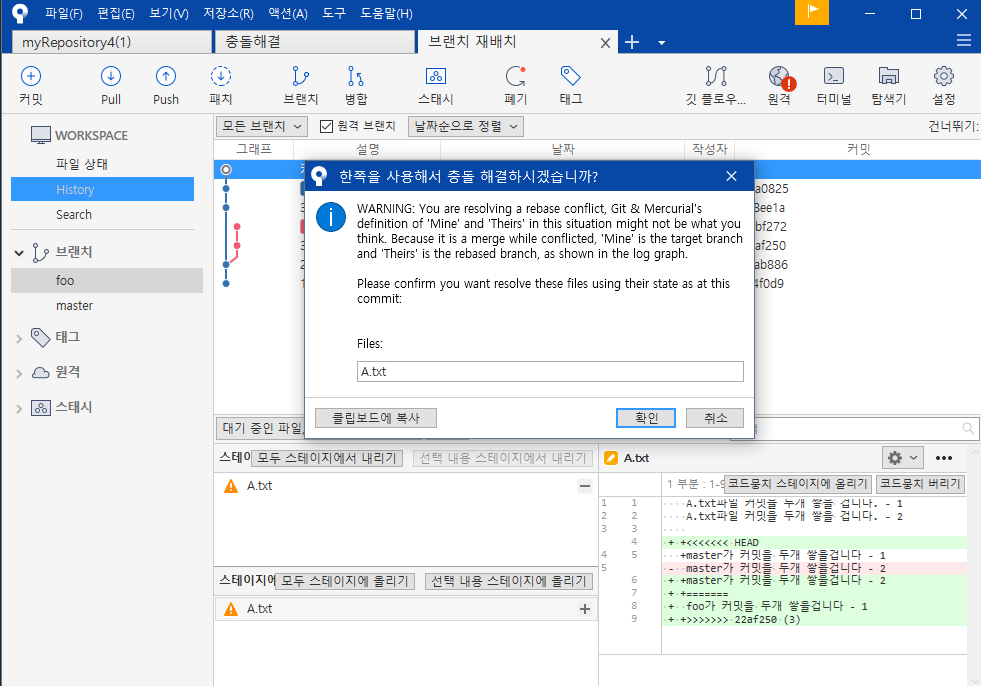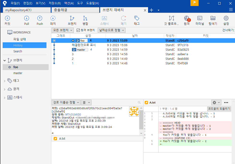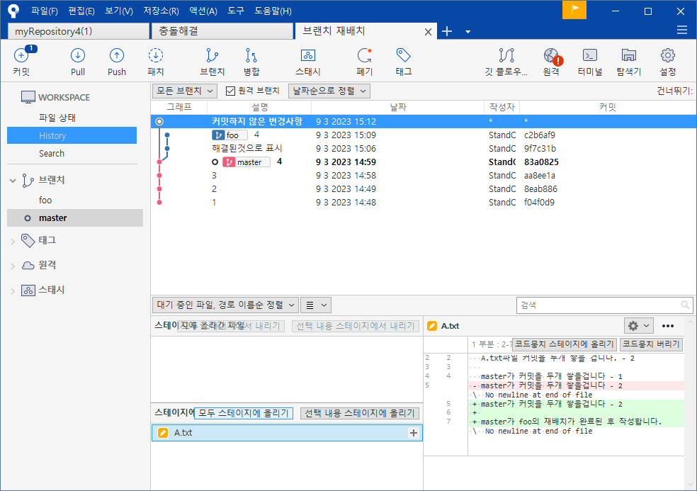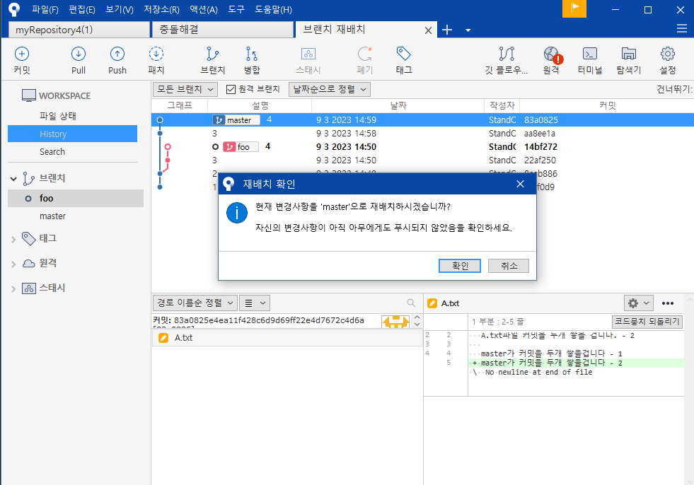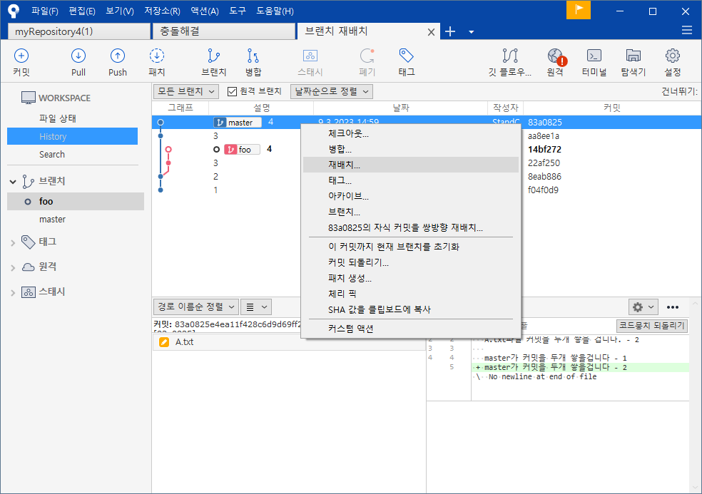 foo브랜치 선택 - 원하는 커밋영역 - 마우스오른쪽 - 재배치 - 확인