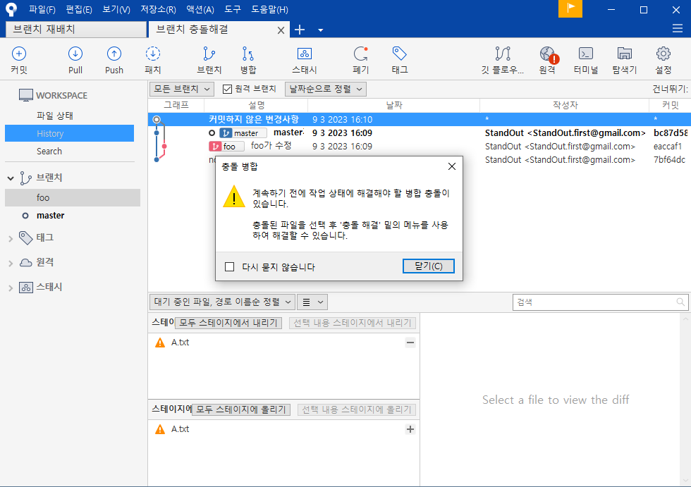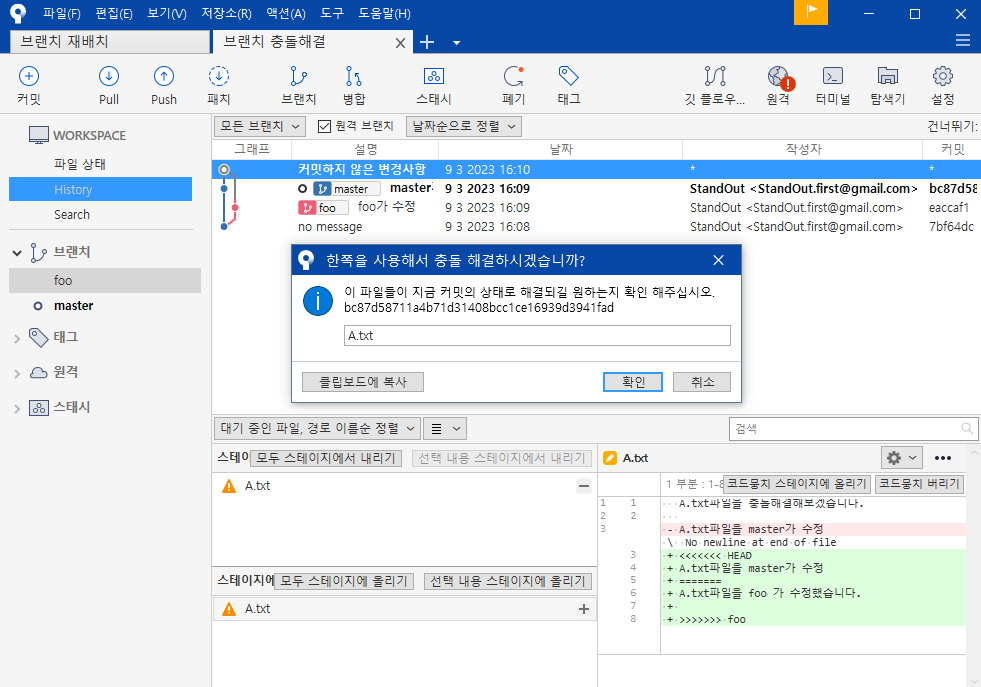 소스트리는 임의로 막 저장하지않고, 병합시 이 둘중 하나를 선택해 달라고 한다.
