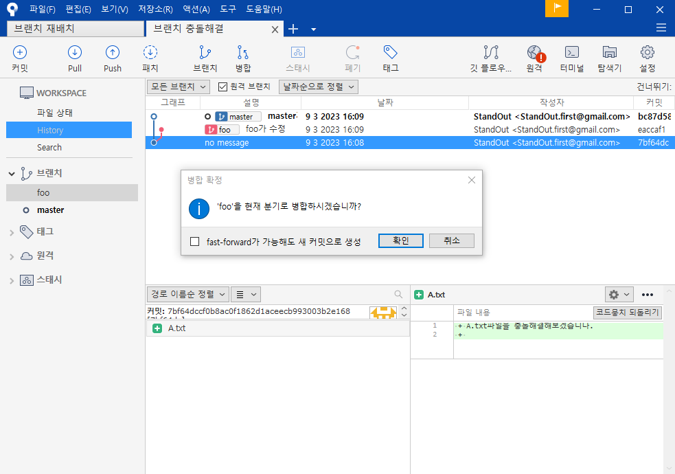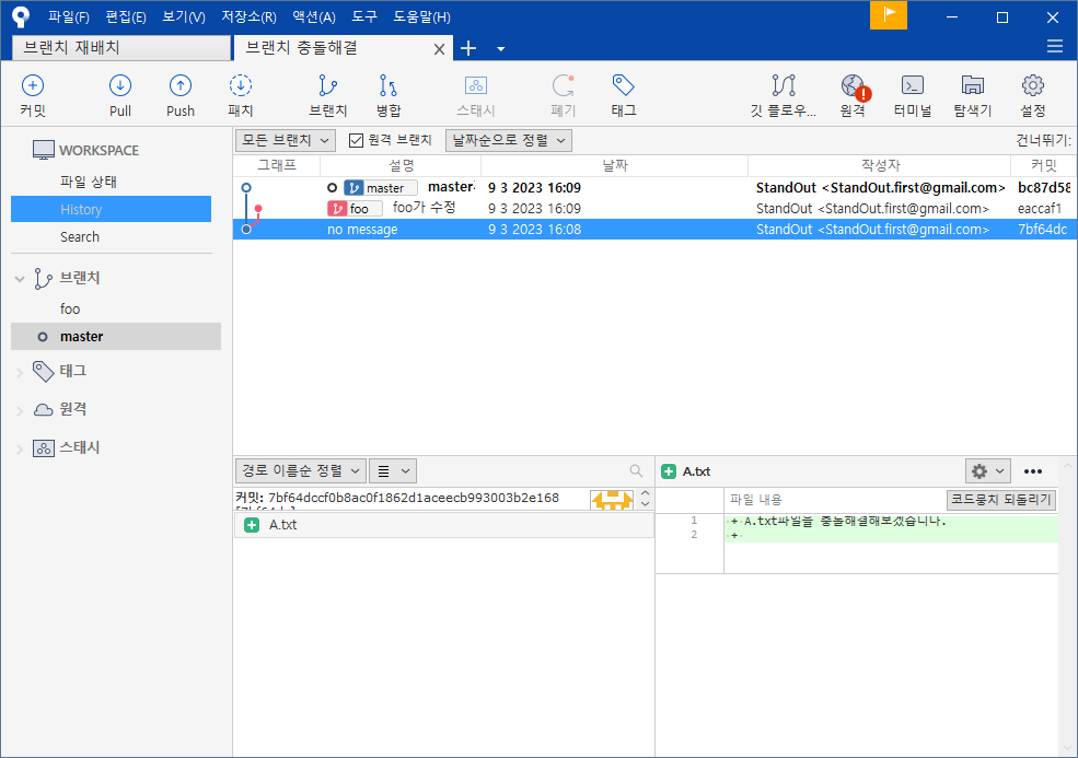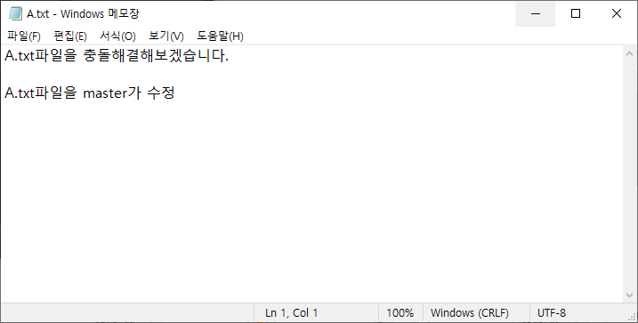 현재 같은 파일을 각각 수정한 상태, 병합을 시도해보자.