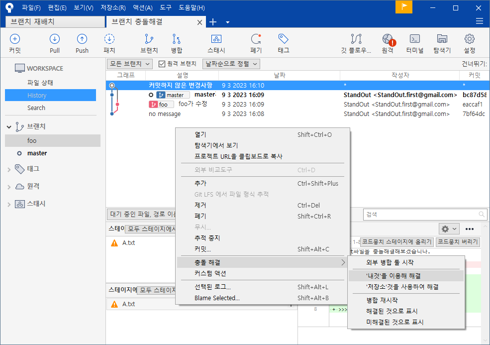 스테이지 - 충돌해결 - '내것' '저장소(master)것'선택 사용하여 해결 - 확인