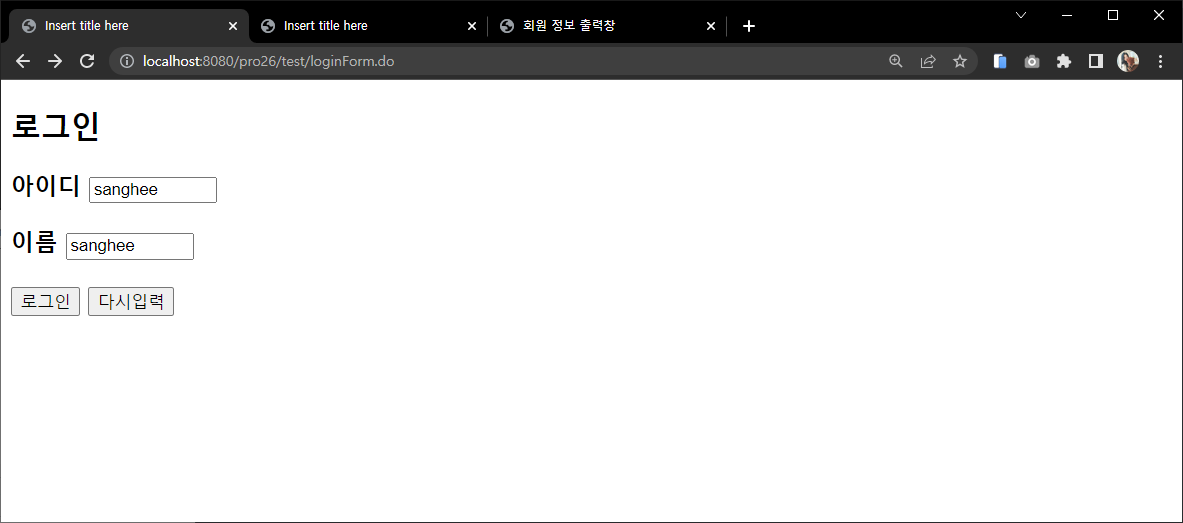 이메일값은 hidden input의 값으로 RequestParam으로 가져와 출력한다. 입력된 정보는 ModelAttribute info2의 체이닝 id, name값이 출력한다.