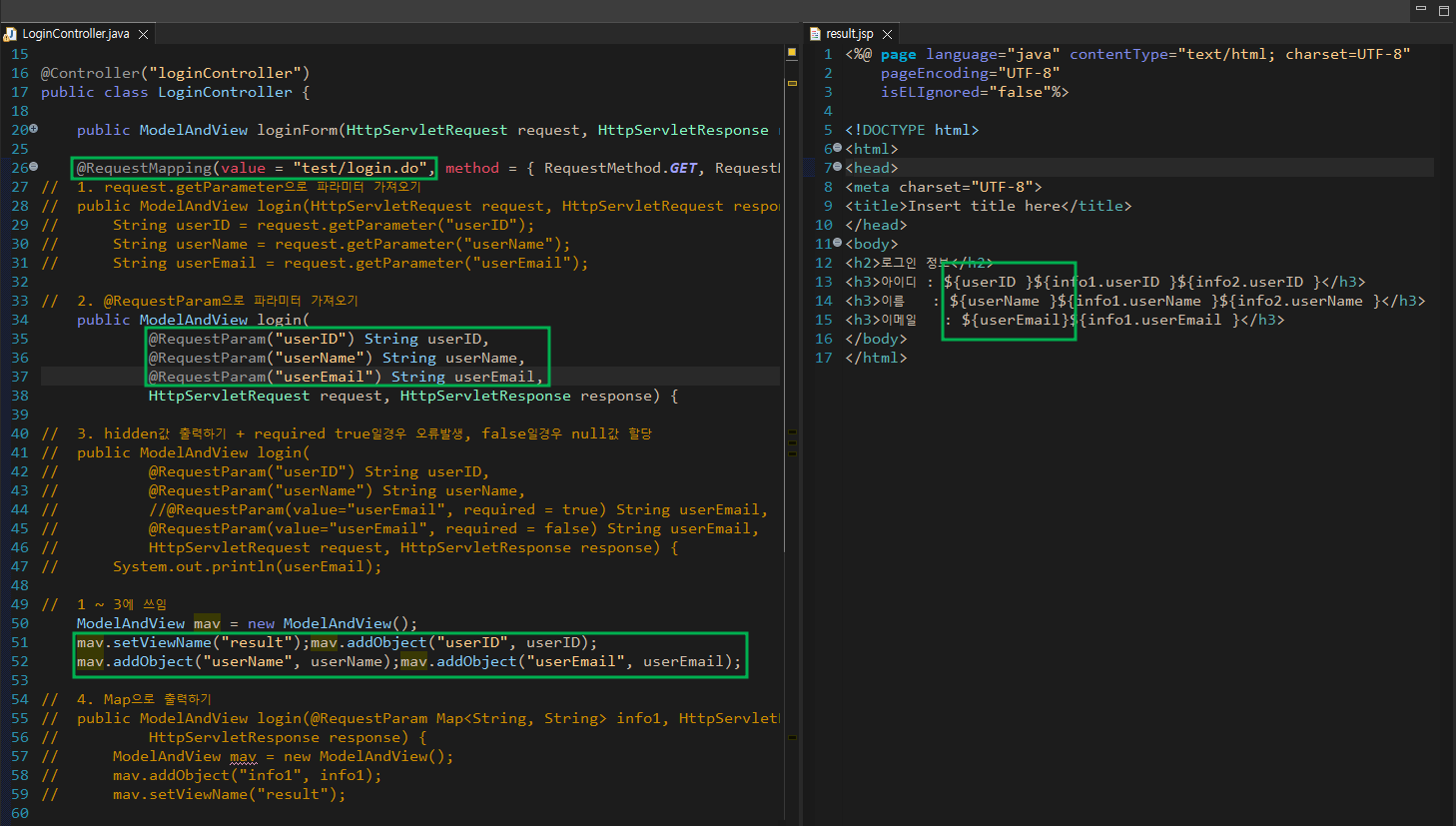 애너테이션 @requestparm을 이용해 input value들을 가져와 result.jsp에 뿌려줄수있다.