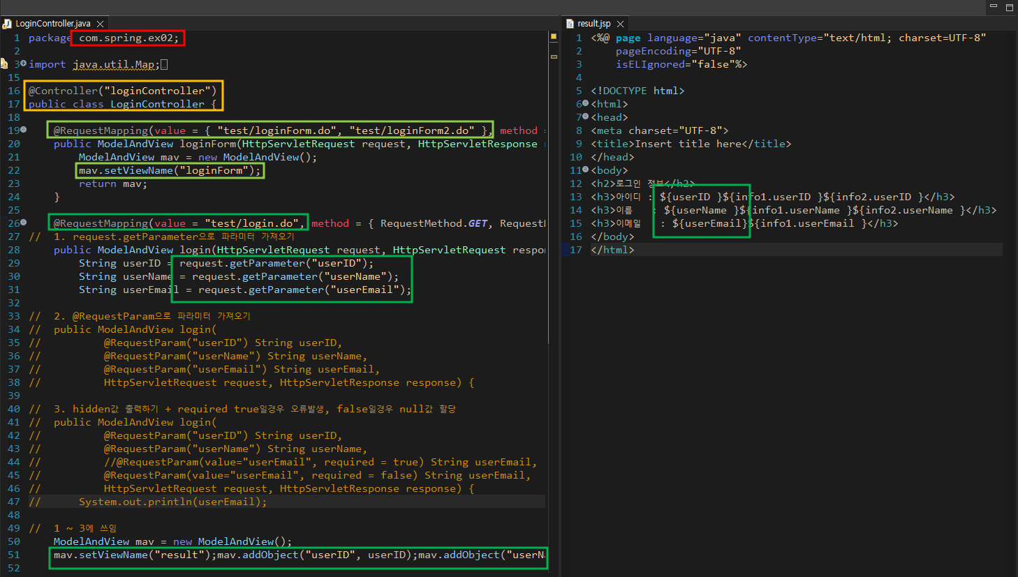request.getParameter()된 input값들이 mav에 addObject되어 출력된다.