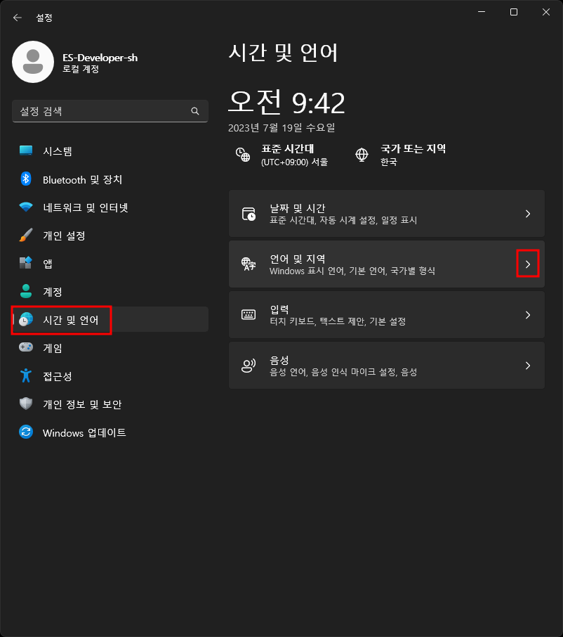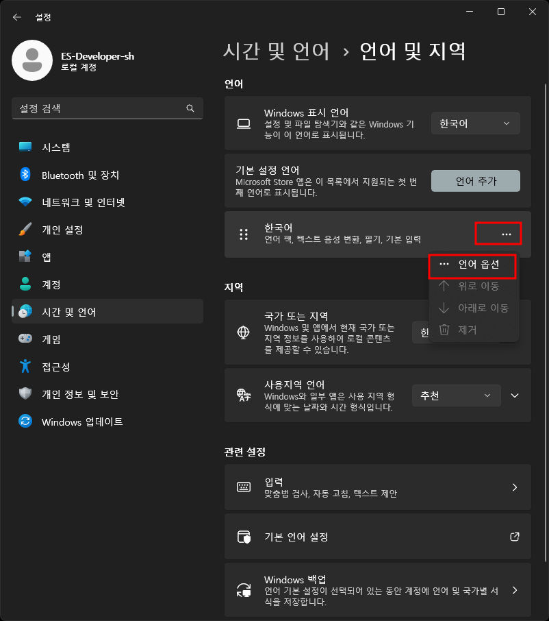 시작메누 - 마우스오른쪽 - 설정 - 시간 및 언어 - 언어 및 지역