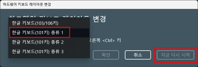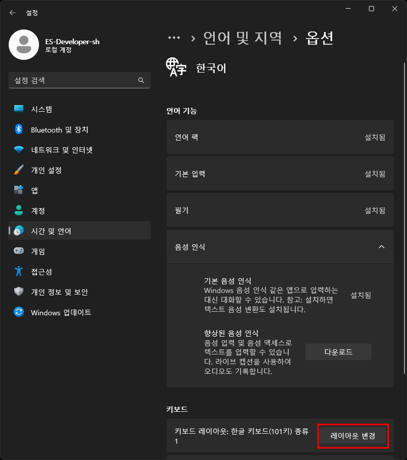 한국어 - 언어옵션 - 키보드 - 레이아웃변경